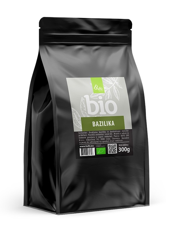 OSNOVNI PODATKI: Bazilika (Ocimum basilicum) BUFO ORGANIC iz kontrolirane ekološke pridelave. Je začimba, ki je k nam prišla iz Indije, priljubljena pa je bila že pri starih Rimljanih. Poznamo veliko sort in vrst bazilike, med seboj pa se razlikujejo po obliki, barvi, velikosti listov in aromi. Je rastlina enoletnica in se na vrtu lepo ujema z večino vrtnin. Bazilika se zelo pogosto uporablja v kulinariki, prepoznamo pa jo po njenem značilnem vonju.