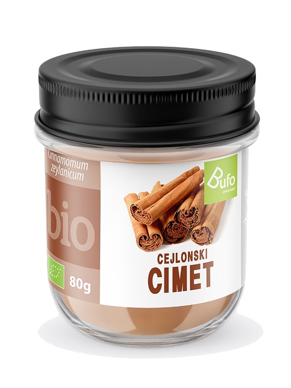 OSNOVNI PODATKI: Cimet v prahu - cejlonski BUFO ORGANIC iz kontrolirane ekološke pridelave. Cejlonski cimet ali Cinnamomum zeylanicum je ena izmed najstarejših začimb, ki jo pridobivajo iz lubja cimetovca. Cimet je bil zelo cenjena začimba že pri starih Egipčanih, predvsem so ga v tistem času pogosto uporabljali zdravniki za lajšanje različnih težav. Danes je cimet ena izmed najbolj pribljubljenih začimb, predvsem zaradi njegove vsestranske uporabe in aromatičnosti. Cimetu daje značilen vonj in okus sestavina kumarin, ki ga lahko najdemo v različnih koncentracijah. Kot vse dišavnice tudi cimet vsebuje eterično olje, med katerimi ima največji delež cinaldehid. Cejlonski cimet vsebuje manj kumarina kot kitajski cimet, prav tako pa sta njegova aroma in vonj manj intenzivna.