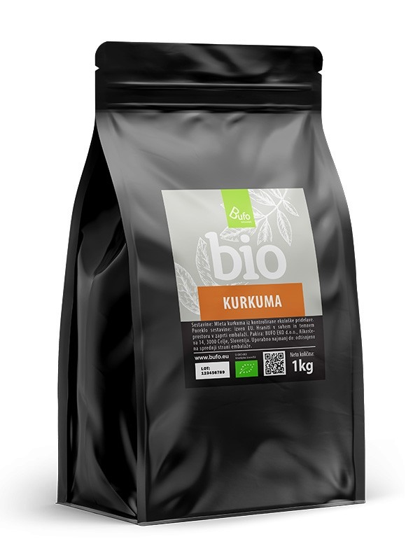 OSNOVNI PODATKI: Kurkuma v prahu BUFO ORGANIC iz kontrolirane ekološke pridelave. Kurkuma ali Curcuma longa je začimba, ki izvira iz tropskih gozdov jugovzhodne Azije. Je trsu podobna trajnica, visoka do enega metra, ki razvije velike dekorativne liste in oranžne, bele, roza, vijolične ali rumene cvetove. Najbolje uspeva v polsenčnih legah na temperaturi od 20°C do 30°C. Korenika je hruškasto oblikovana in živo oranžne barve. Rumeno oranžno barvilo v rastlini je kurkumin, ki ima antioksidativne lastnosti. Kurkuma je po okusu blago pikantna in spominja na mešanico ingverja in pomaranče. Je obvezna sestavina začimbne mešanice za indijski curry, saj le-temu daje žarečo rumeno barvo.