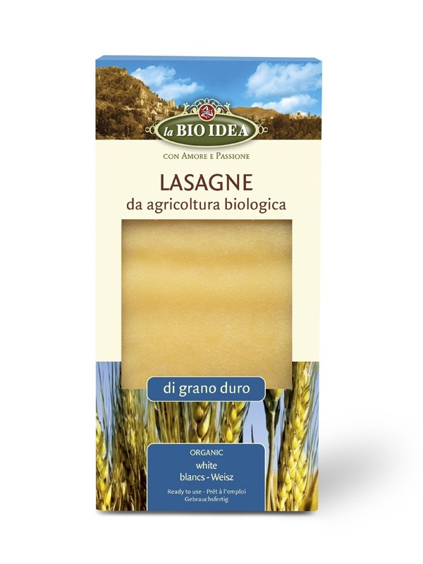Bela lazanja iz pšeničnega durum zdroba iz kontrolirane ekološke pridelave LA BIO IDEA je narejena po klasičnem postopku sušenja pri nizkih teperaturah. Iz sveže mlete moke brez jajc in ostalih dodatkov.