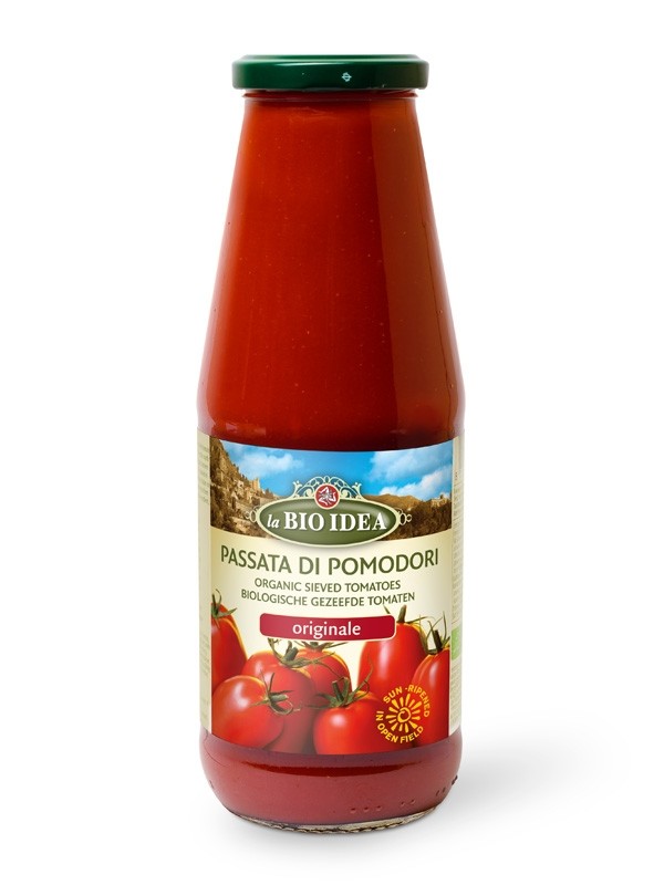 OSNOVNI PODATKI: Paradižnikova omaka iz ekološke pridelave LA BIO IDEA, drugače poimenovana tudi passata, je pripravljena iz najboljših sicilijanskih paradižnikov, ki morajo pred predelavo skozi strog postopek izbire. 680g steklenica pasiranega paradižnika vsebuje kar 1,5 kg svežih, izbranih ekoloških paradižnikov. Izdelki iz paradižnika LA BIO IDEA so proizvedeni iz BIO paradižnika, ki je popolnoma dozorel in pridelan na ekološki način. Paradižniki prihajajo iz Sicilije, kjer jim izredno hranljiva vulkanska prst in obilica sonca omogočata prvovrstno kvaliteto. Kmetijske površine niso prekomerno gnojene, zato je okus paradižnika bistveno boljši kot pri konvencionalno pridelanem paradižniku. Za paradižnik je namreč značilno, da pri prekomernem gnojenju z dušičnimi gnojili izgublja na okusu. Paradižnik, pridelan na naraven, ekološki način, je v vsakdanji prehrani še kako pomemben.