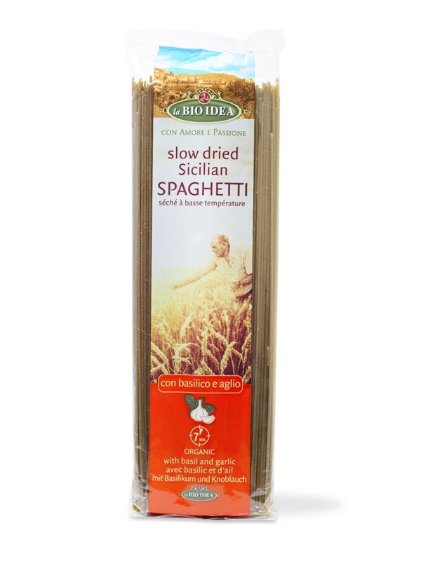 OSNOVNI PODATKI: Bio špageti iz durum zdroba iz kontrolirane ekološke pridelave LA BIO IDEA so narejeni po klasičnem postopku sušenja pri nizkih teperaturah. Iz sveže mlete moke brez jajc z dodatkom česna in bazilike. Zaradi svoje hranljivosti in enostavne priprave so testenine priljubljena jed po vsem svetu. Za izdelavo odličnih testenin je potrebno veliko profesionalnega znanja. Izdelava dobrih testenin pa ni odvisna samo od recepture, temveč tudi od izbire visokokvalitetnih žit, pravilnega mletja in izdelave testa. Testenine La Bio Idea odlikujeta 100 letna tradicija in tehnologija, ki se naslanja na stare postopke. Tako bele kot polnozrnate testenine La Bio Idea so proizvedene iz najboljšega, ekološko pridelanega zdroba iz pšenice durum s Sicilije, kjer mu okus in aromo dajeta hranljiva vulkanska prst in milo podnebje. Pšenico meljejo v lastnem mlinu tik pred izdelavo testenin, ki so proizvedene po tradicionalnem postopku sušenja pri nizkih temperaturah, tako da ne pride do oksidacije, s čimer testenine ohranijo svojo naravno bogato aromo, barvo in okus. Pri polnozrnatih testeninah je v procesu mletja zmleto celo žitno zrno, s čimer se ohranja hranljiva vrednost žita.
