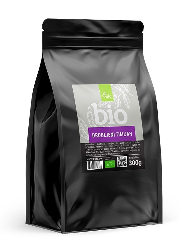 OSNOVNI PODATKI: Drobljeni timijan BUFO ORGANIC iz kontrolirane ekološke pridelave. Timijan ali Thymus vulgaris uvrščamo v družino ustnatic. Timijan poznamo tudi pod imenom materina dušica. Gre za grm, ki zraste do višine 40 cm in se brez težav križa z drugimi vrstami. Domovina timijana je Sredozemlje, poznali pa so ga že stari Egipčani. Poznamo različne vrste timijana, ki se med seboj razlikujejo po intenzivnosti vonja, arome in okusa. Med kuhanjem timijan ohranja močan izrazit vonj in okus, je pa pomembno vedeti kdaj ga dodati. Če želimo, da je po okusu močnejši, ga dodamo že na začetku pečenja ali kuhanja. V primeru, da ne želimo izrazitejšega okusa, ga dodajamo na koncu priprave.