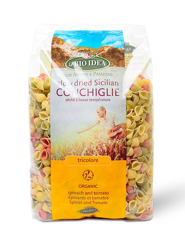 OSNOVNI PODATKI: Tribarvne školjke La BIO IDEA iz kontrolirane ekološke pridelave vas bodo prepričale s svojim okusom in barvitostjo. Zaradi svoje hranljivosti in enostavne priprave so testenine priljubljena jed po vsem svetu. Za izdelavo odličnih testenin je potrebno veliko profesionalnega znanja. Izdelava dobrih testenin pa ni odvisna samo od recepture, temveč tudi od izbire visokokvalitetnih žit, pravilnega mletja in procesa izdelave testa. Bio tribarvne školjke na Siciliji po klasičnem postopku sušenja pri nizkih temperaturah proizvaja družina Barbagallo. Tako bele kot polnozrnate testenine La Bio Idea so proizvedene iz najboljšega, ekološko pridelanega zdroba iz pšenice durum s Sicilije, kjer mu okus in aromo dajeta hranljiva vulkanska prst in milo podnebje. Pšenico meljejo v lastnem mlinu tik pred izdelavo testenin, ki so proizvedene po tradicionalnem postopku sušenja pri nizkih temperaturah, tako da ne pride do oksidacije, s čimer testenine ohranijo svojo naravno bogato aromo, barvo in okus. Pri polnozrnatih testeninah je v procesu mletja zmleto celo žitno zrno, s čimer se ohranja hranljiva vrednost žita. Z dodatkom špinače oziroma paradižnika v prahu so te testenine obarvane in prijetnega okusa, kar je še posebej zanimivo otrokom.